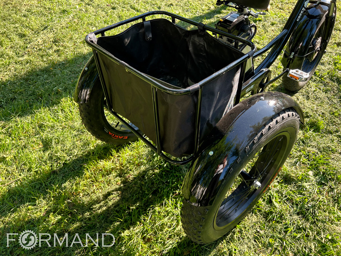 Электровелосипед GreenCamel Трайк-F20 (R20FAT 500W 48V12Ah) предназначен для прогулочного катания и перевозки грузов. Отлично подходит для использования на даче, в деревне, в личном подсобном хозяйстве. Электровелосипед собран на прочной раме из высокоуглеродистой стали, имеет передний амортизатор и оснащен тремя колесами (одно спереди и два сзади). Благодаря трехколесной базе, транспорт намного более стабилен и устойчив, и им смогут воспользоваться люди, не привыкшие к двухколесным велосипедам. Отличием этой модели являются и широкие фэтбайкерские покрышки (JILUER 20x4.0) повышенной проходимости. У электровелосипеда удобная низкая посадка, широкий руль, большое комфортное седло. Сзади расположена вместительная корзина для багажа, впереди дополнительная корзинка, над колесами – полноразмерные крылья, защищающие от грязи.