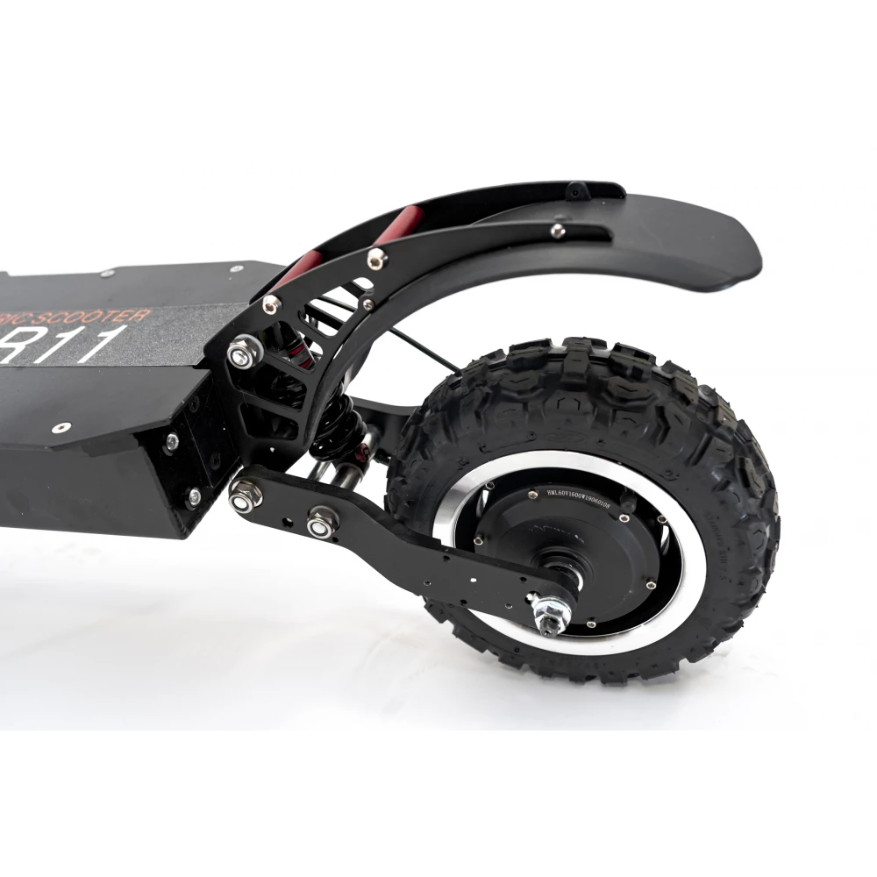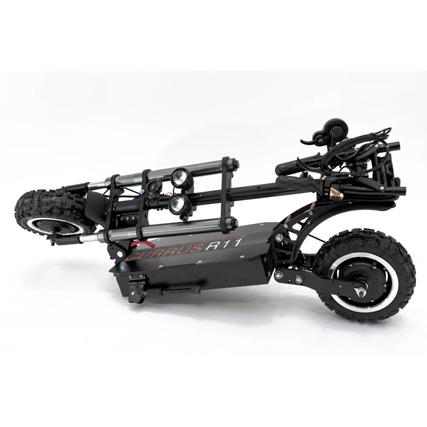 Currus R11 с усиленной рулевой стойкой, гидравлическими амортизаторами впереди и маятниковым сзади. Электросамокат имеет полный привод, общая мощность агрегата 3200 Вт. С возможностью отключение одного двигателя при необходимости. Транспортное средство развивает максимальную скорость свыше 80 км/ч. Повышенная емкость батареи до 32 А*ч позволяет преодолевать на одном заряде до 90 км пути.