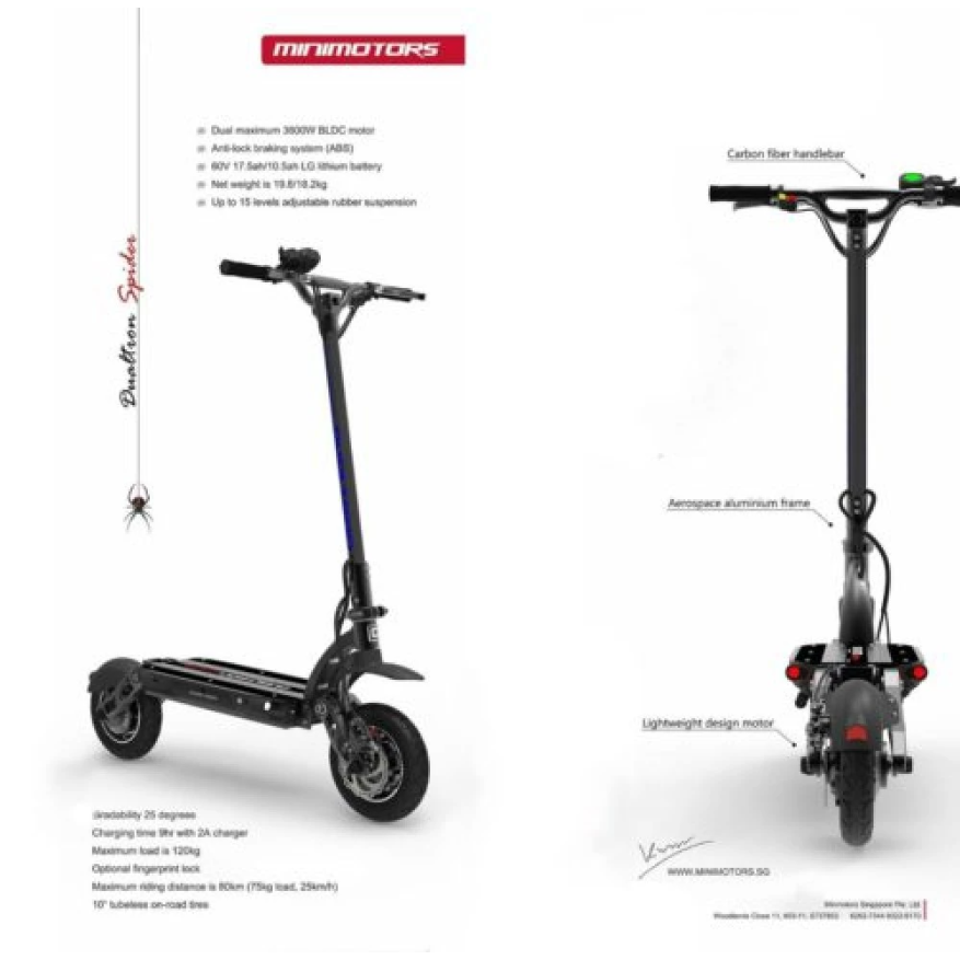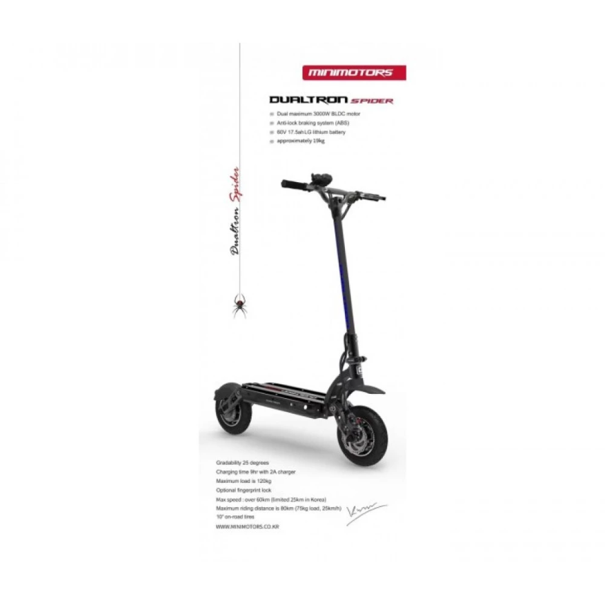 Dualtron Spider оснащен электродвигателями мощностью 1600 Вт. Развивает максимальную скорость движения 65 км/ч. В данной комплектации предусмотрен более емкий аккумулятор, который повышает дальность хода до 100 км пути. Его емкость составляет 24.5 А*ч. Так как агрегат полноприводный, есть возможность отключать один двигатель, для экономии заряда батареи. Два скоростных режима позволяют подстраивать стиль вождения под дорожную ситуацию. Есть режим Турбо и Эко. Эко-режим отлично подходит для начинающих пользователей.