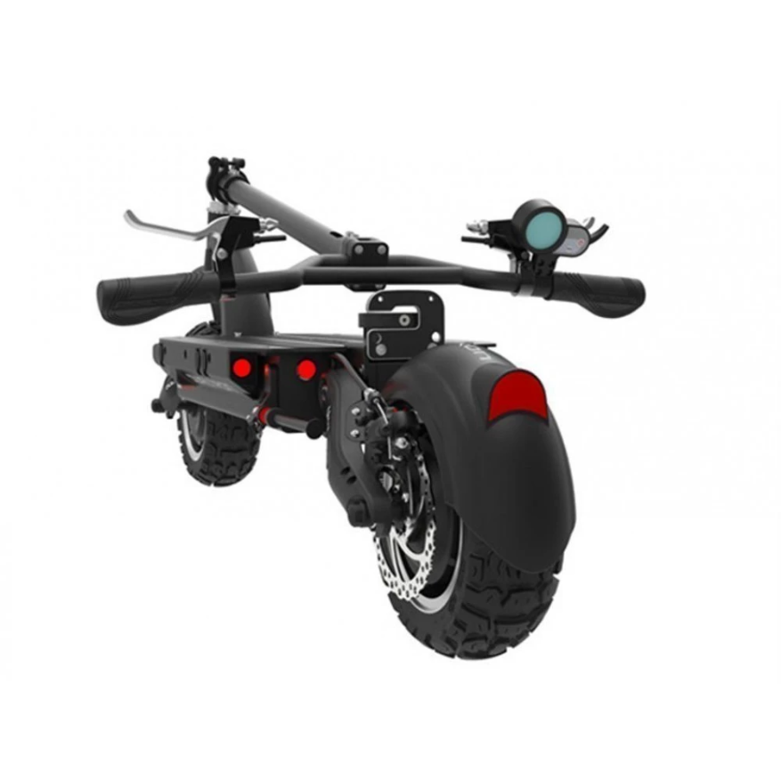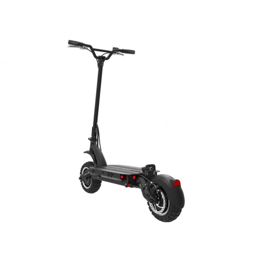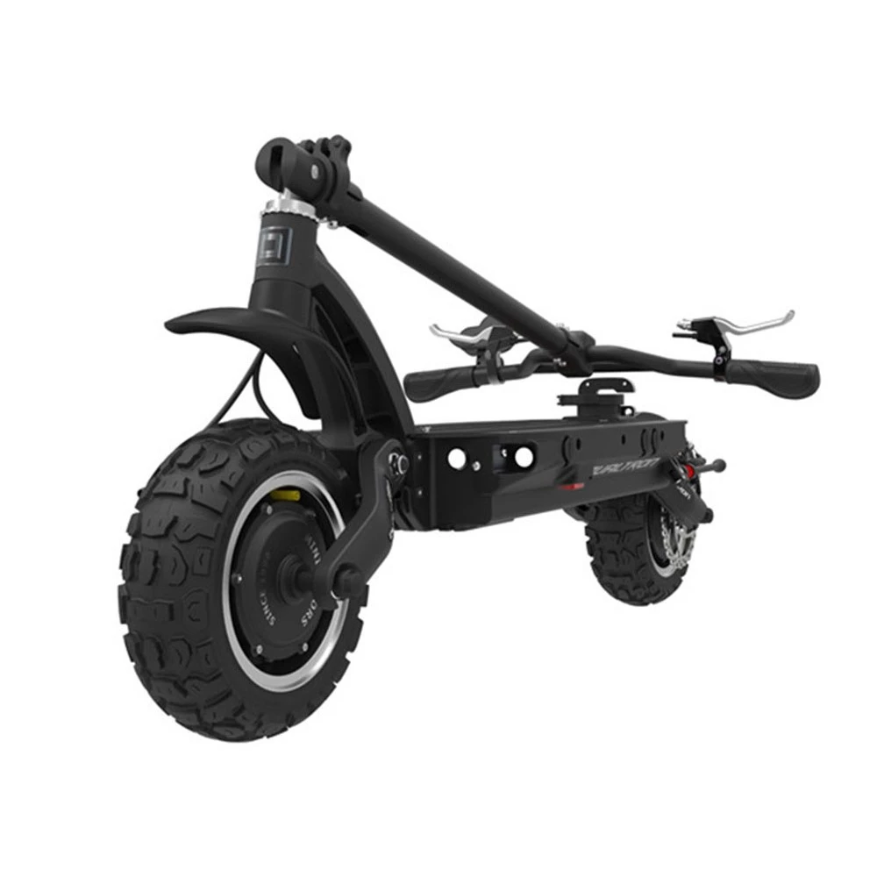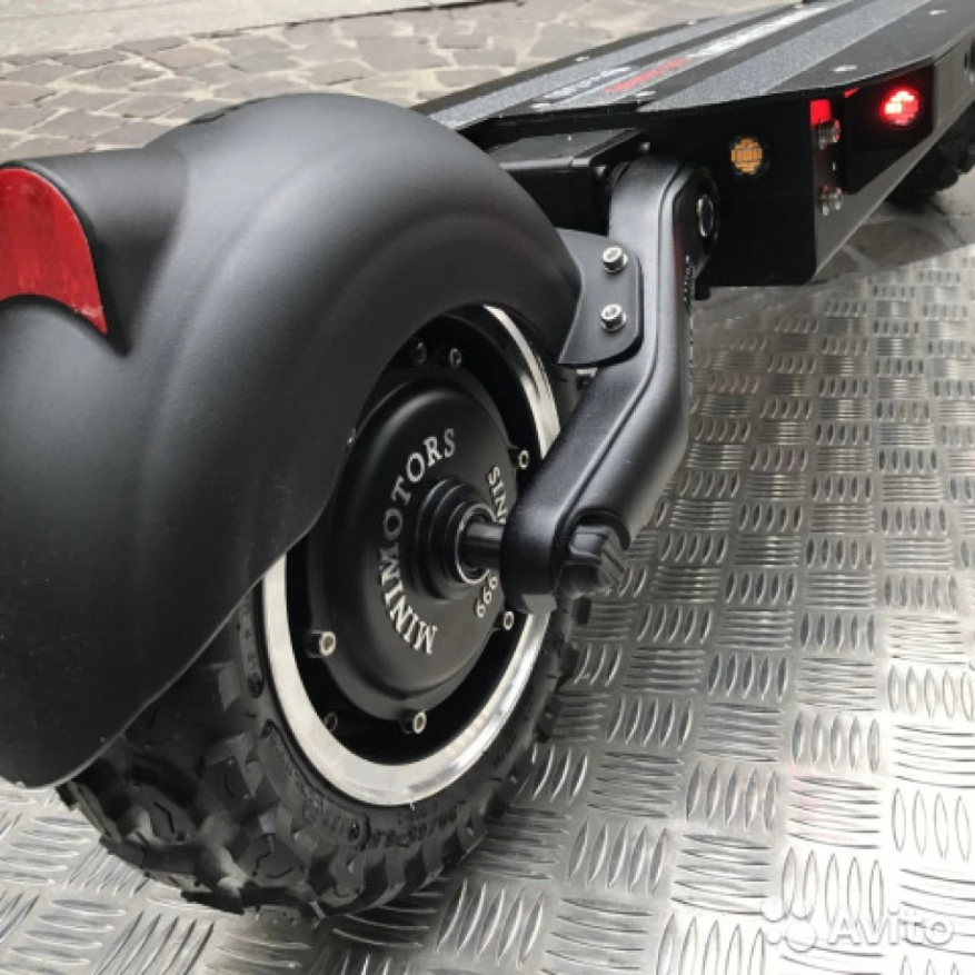 Электросамокат имеет два мотор-колеса, мощность каждого по 2700 Вт. Максимальная скорость 85 км/ч, ее можно сравнить со скоростью автомобиля. При желании спокойного передвижения и в целях экономии заряда, можно легко отключить один мотор. Рама выполнена из высокопрочного и легкого алюминия. Складывается, нет проблем с местом для хранения.