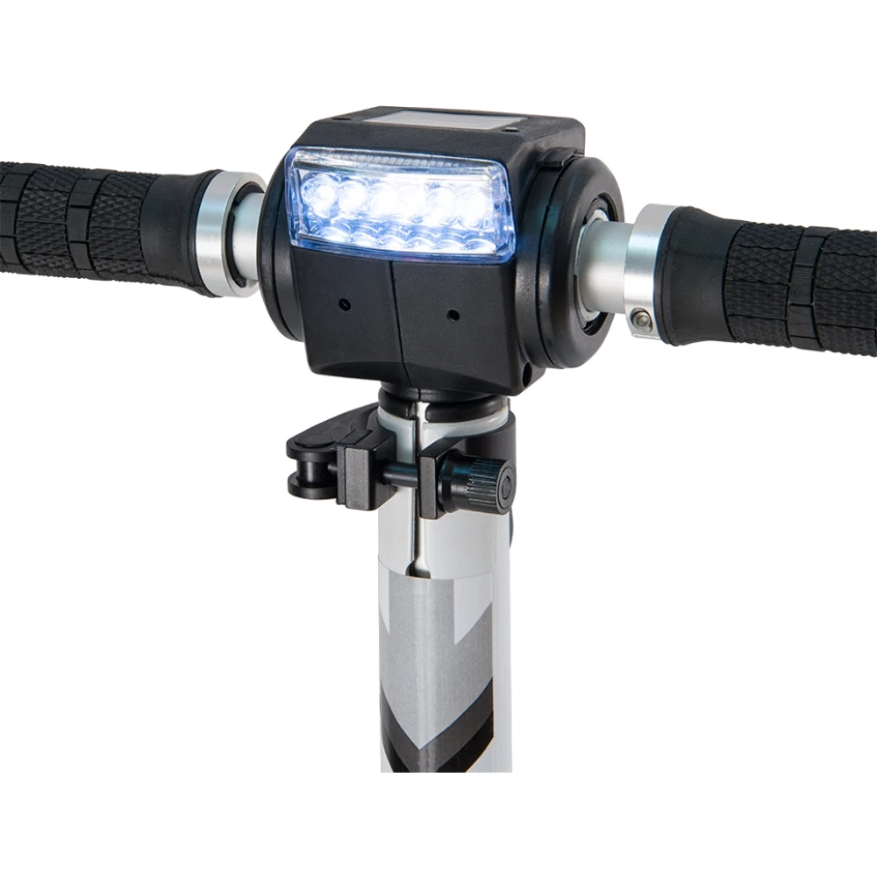 Аккумулятор 6.5 А/ч заряжается в сети 220 вольт 3.5 часа, его заряда хватает на пробег 30 км. За этими показателями можно вести контроль по информационному дисплею. Есть светодиодная фара, для освещения дороги в темноте она расположена на рулевой стойке, звуковой сигнал поможет привлечь внимание.