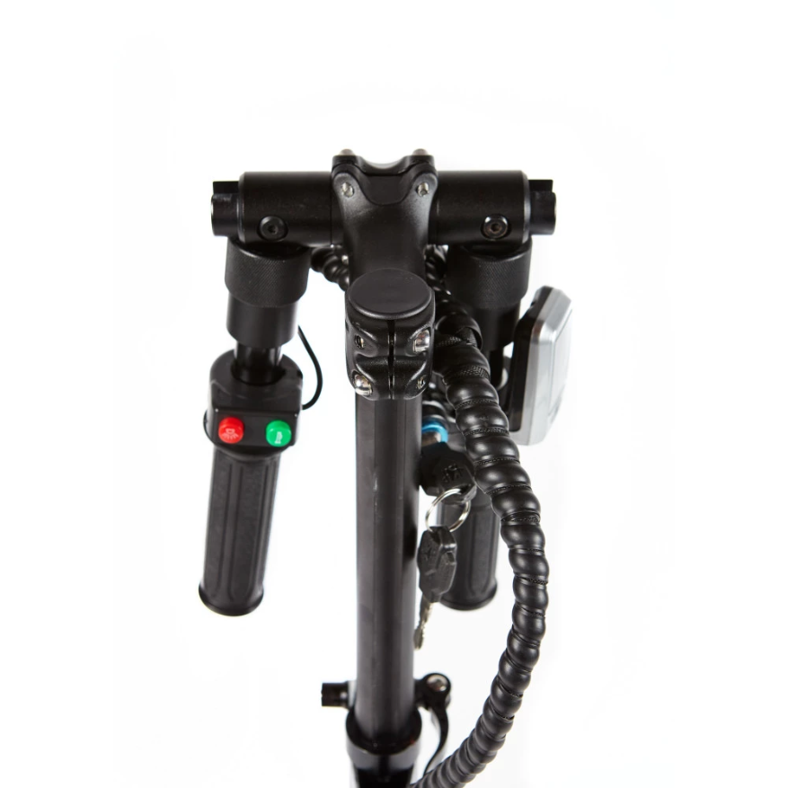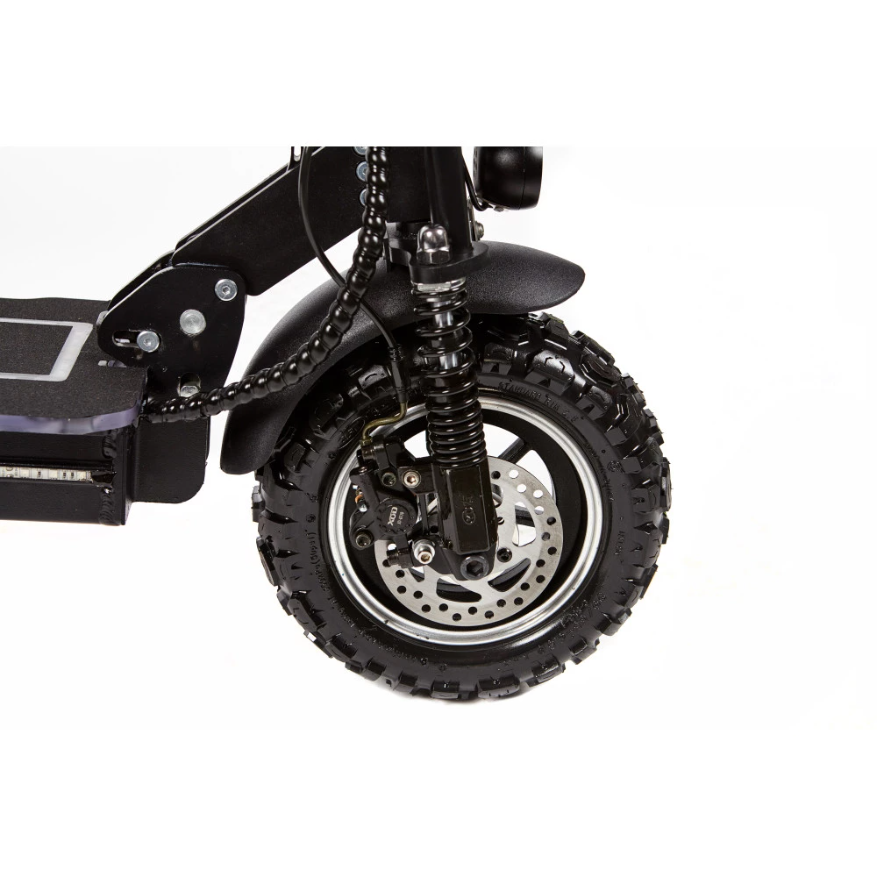 Самокат Eco Drive Titan оснащен колесами диаметром 11 дюймов, внедорожные, рельефные покрышки повышают проходимость транспорта, шины накачиваются воздухом. На переднем и заднем колесах установлены дисковые тормоза. Пружинные амортизаторы улучшают движение по бездорожью, смягчая ход транспорта.