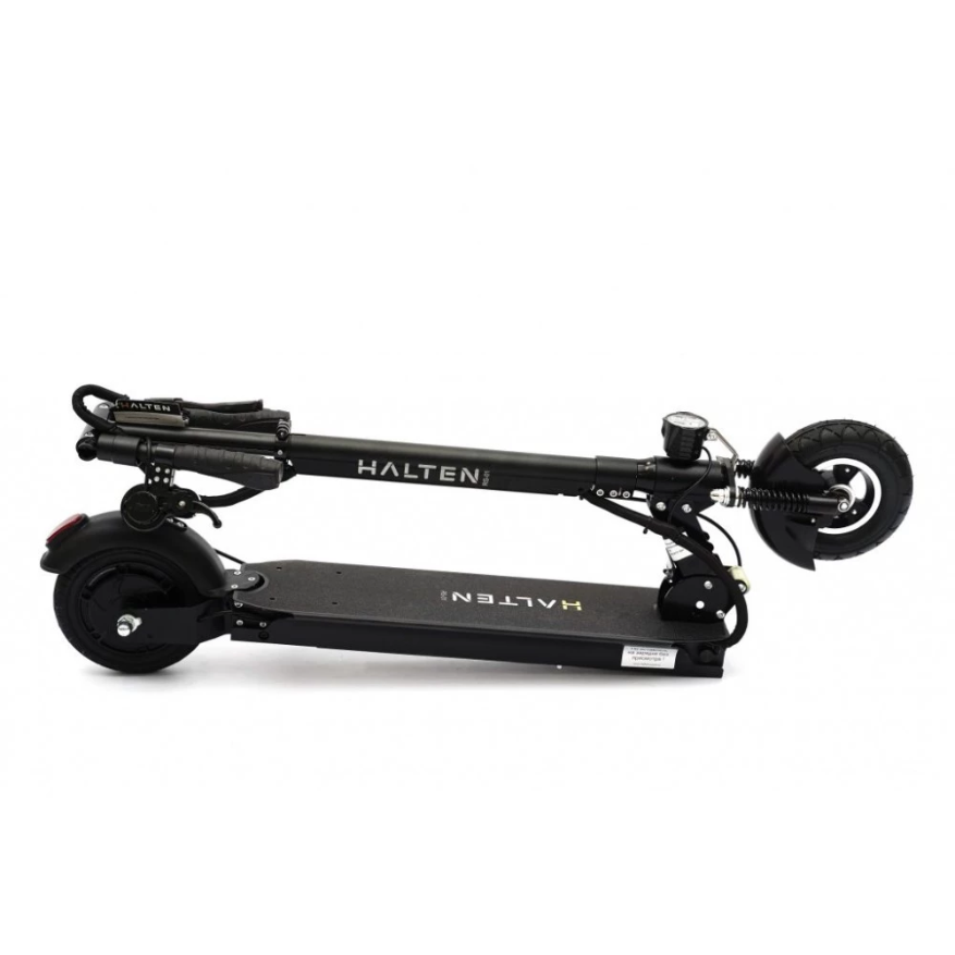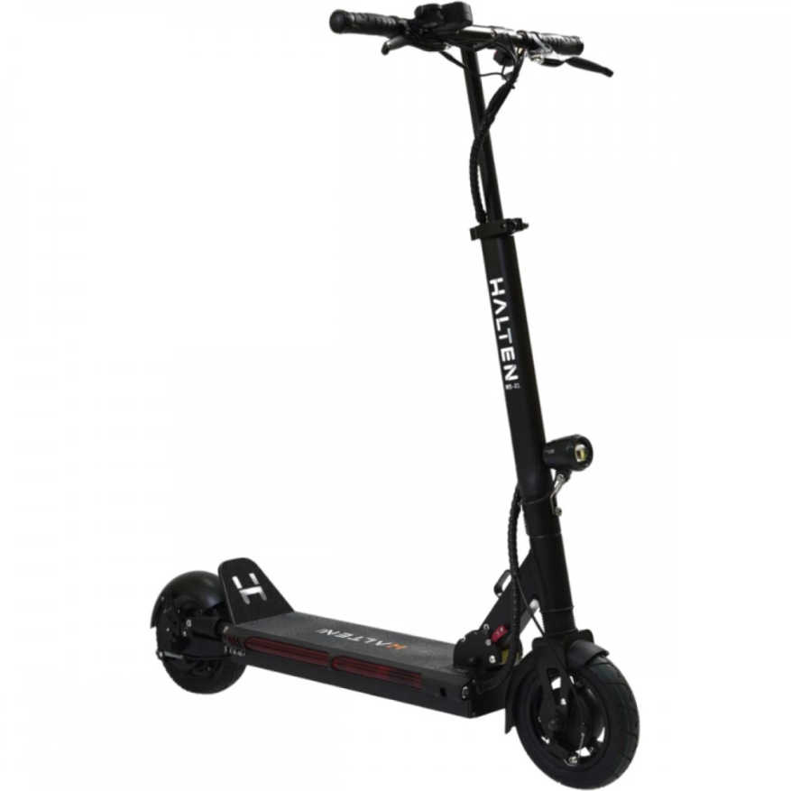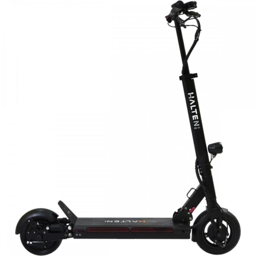 Электросамокат Halten RS-01 оснащен аккумулятором 15 Ah, этого заряда хватает на 35 км пути. Транспорт имеет яркую фару впереди, стоп-сигнал на заднем крыле. Бортовой компьютер позволит контролировать основные показатели, уровень заряда батареи. Складная конструкция уменьшает в сложенном состоянии габариты в два раза. Ручки руля тоже складываются. Его не сложно транспортировать, поместиться в багажник автомобиля, весит электросамокат 16 кг, не трудно переносить в руках.