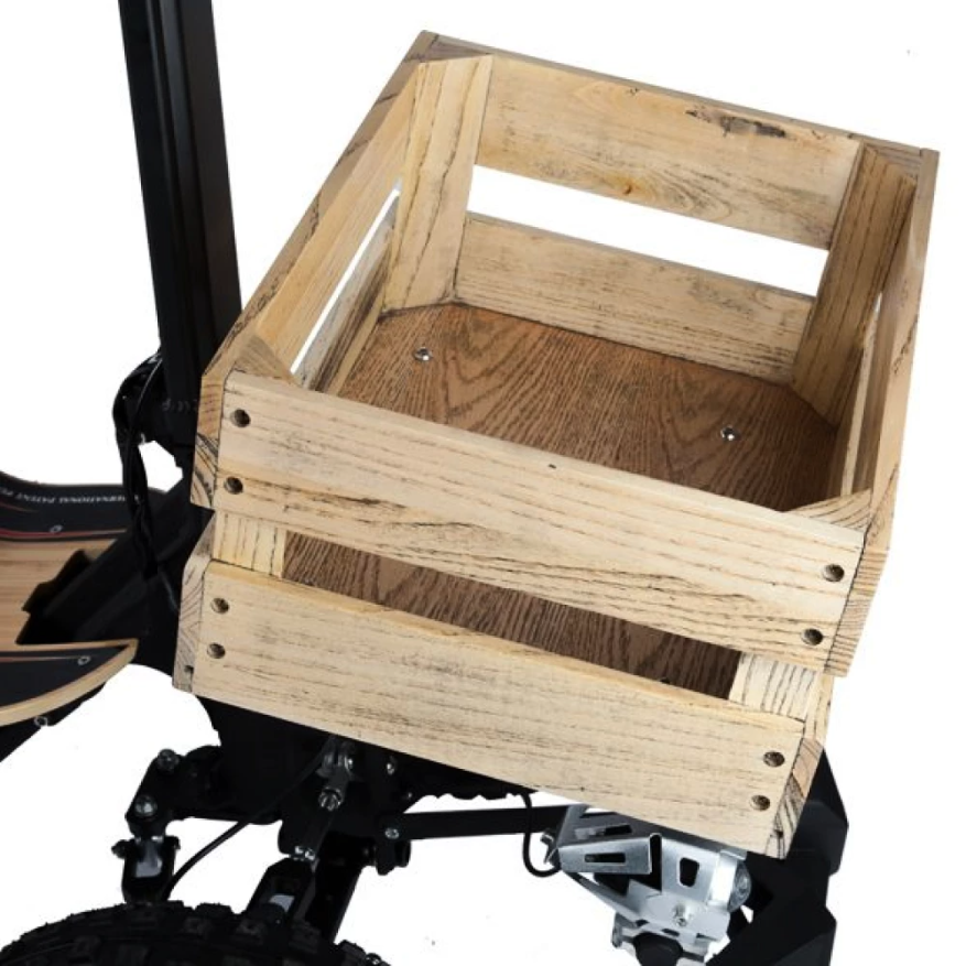 Одним из особенностей этого электросамоката является деревянная корзина, которая добавляет элегантности и практичности. Благодаря этой корзине вы можете легко и удобно перевозить свои вещи, будь то покупки или личные предметы.