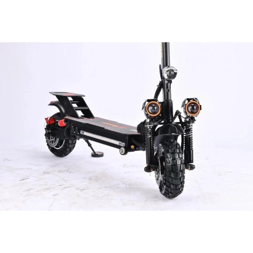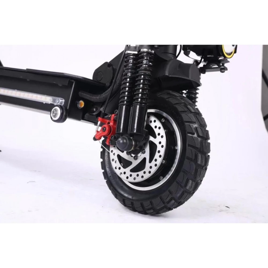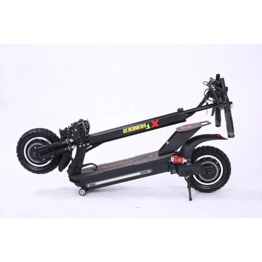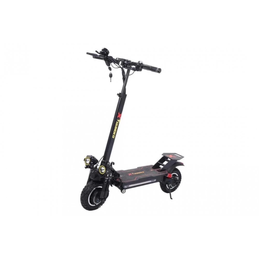 Электросамокат WS-Thunder 2400W 48V21ah - достойный представитель городского экологического транспорта. Производители оснастили данную модель производительными моторами суммарной мощностью 2400 W, которые позволяют развивать впечатляющую скорость до 50 км/час. Полный привод обеспечивает хорошую проходимость и возможность преодолевать подъемы и небольшие препятствия на пути. Во время движения по ровным городским улицам полный привод можно отключить, что уменьшит расход аккумуляторной батареи. 10-дюймовые колеса с глубоким протектором обеспечивают хорошее сцепление с дорожным покрытием, позволяя сохранять устойчивость при движении и маневрировании. Электросамокат выполнен из прочного алюминиевого сплава и выдерживает нагрузку до 155 кг, вес самого устройства при этом составляет 29 кг. Складная конструкция делает электросамокат более компактным и удобным для хранения и транспортировки. Маленькие колесики в передней части платформы позволяют катить самокат в сложенном виде, не поднимая его полностью. Система освещения включает три элемента в передней части электроскутера (основной фонарь посередине и два дополнительных по бокам), а также три габаритных огня сзади. На боковой части платформы расположена светодиодная подсветка, которая делает электроскутер более заметным в темное время суток.