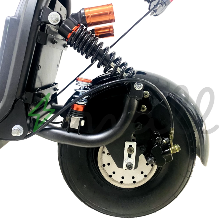 Алюминиевая конструкция рамы благодаря инновационному материалу без труда выдерживает грузоподъемность взрослого человека в 120 кг. Мощностные параметры электродвижка – 1500 Вт и емкая батарея в 15А*ч достаточна для развития скорости 40 км/час и преодоления дистанции в 35 км. Своевременность торможения обеспечена двумя дисковыми тормозами. Комфорт и удобство езды комфортабельным мягким седлом и широкой платформой для ног. Производитель предпринял максимум решений, чтобы райдер испытывал только комфорт.