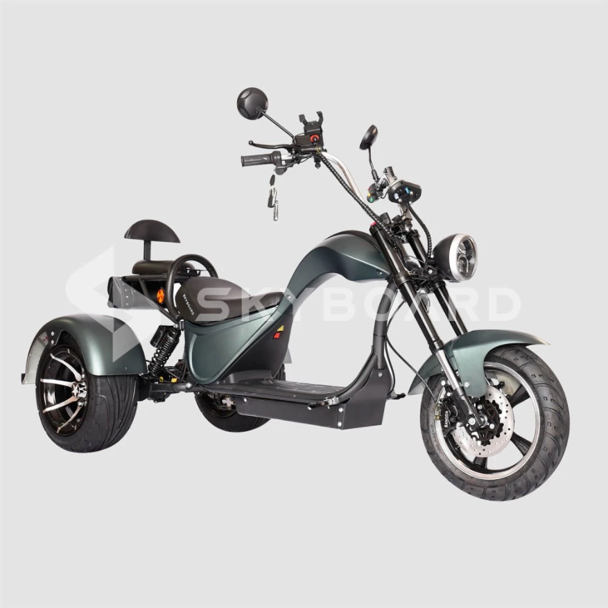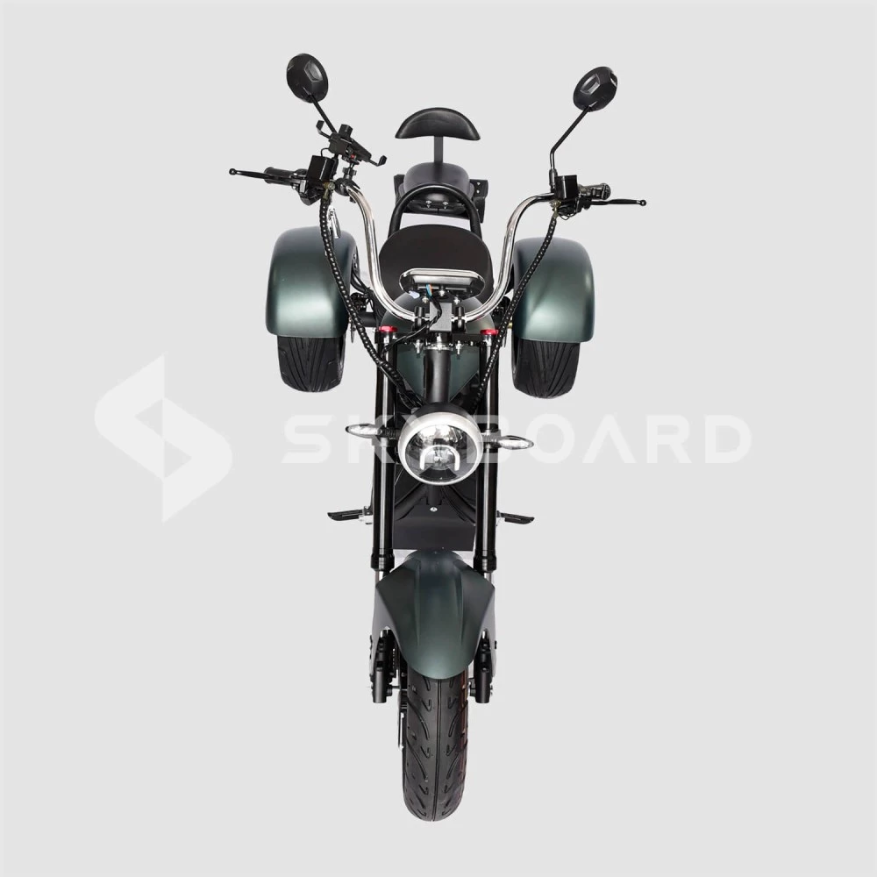Электроскутер SKYBOARD TRIKE CHOPPER-4000 PRO FAST – мощный и эксклюзивный, первое, что приходит на ум при визуальном ознакомлении с техникой. Изогнутая рама, брутальный дизайн наталкивают на мысли о максимальных скоростях и непередаваемых ощущениях. Со слов производителя предчувствие клиентов является правильным.