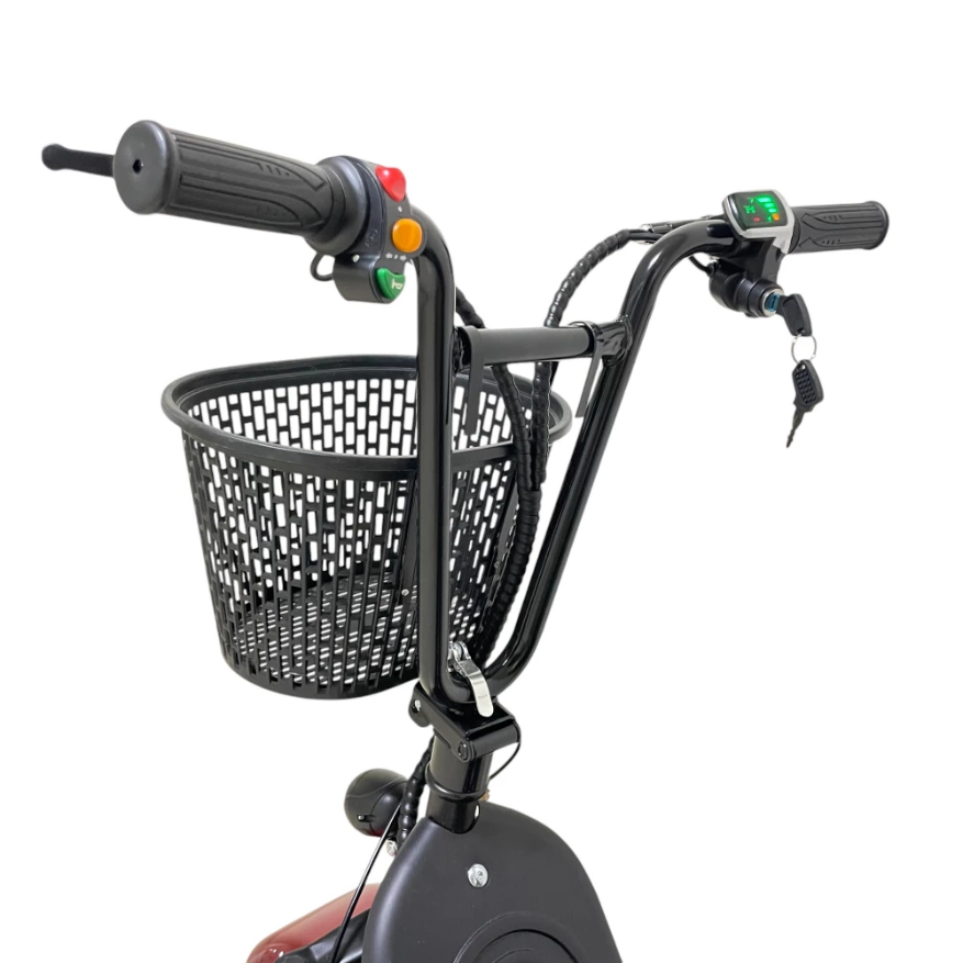 Широкая платформа с брендовой надписью не скользит, не провоцирует случайного падения райдера. Рулевая часть оснащена необходимыми комплектующими и элементами, позволяющими контролировать скоростные характеристики и заряд АКБ. Для удобства перевозки вещей, продуктов электроскутер в передней части имеет корзину.