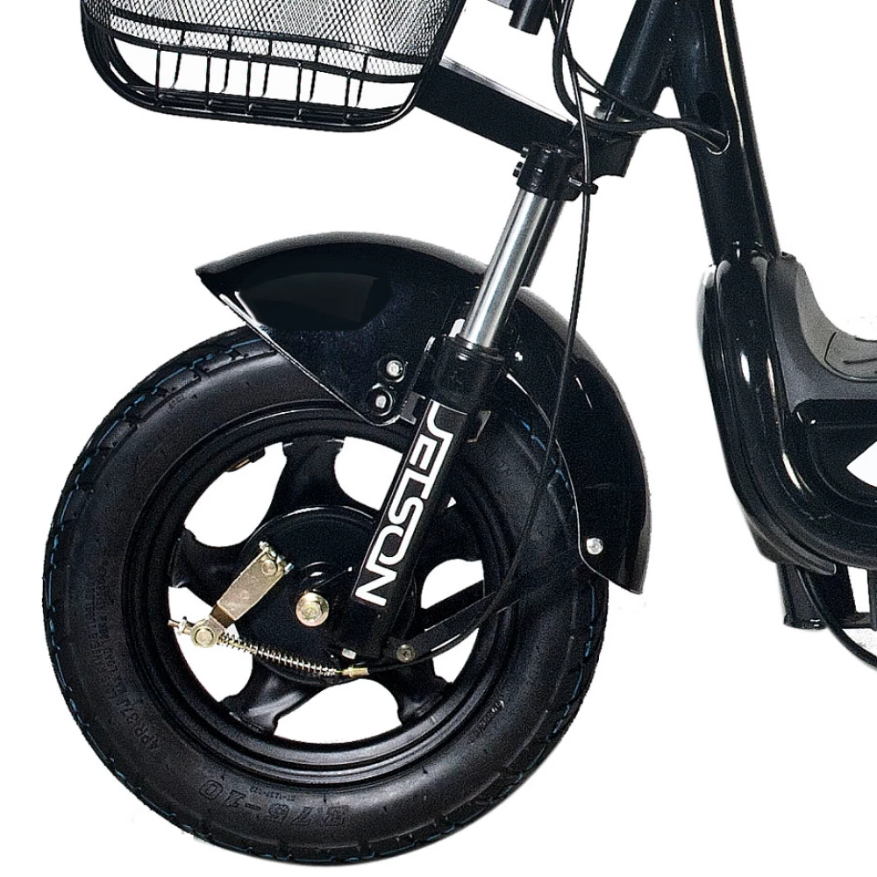 Электроскутер Jetson GS-450 – современный и быстрый вид транспорта. Его электромотор мощностью 450 Ватт позволяет развить скорость до 50 км/ч. Легкосъёмный свинцовый аккумулятор ёмкостью в 20 Ач делает возможным преодолевать до 80 км на одном полном заряде. Зарядка такой ёмкой батареи довольно быстрая – всего лишь 4 часа! Мягкое, широкое седло из экологичной кожи, отличающейся прочностью и долговечностью, делает длительные поездки приятными для пользователя. Кроме того, в комплекте к скутеру идёт дополнительное сидение со спинкой для перевозки пассажиров. Jetson GS-450 имеет хорошую манёвренность, которую обеспечивают широкие 16-дюймовые колёса с высокопрофильной резиной. Удобство в управлении даёт устройство руля, на котором расположены кнопки переключения передач, включения и выключения света, рычажки тормоза и ручка газа с не проскальзывающим покрытием. Эффективные тормоза барабанного типа останавливают скутер крайне мягко, при этом не теряя отдачи. LED-фара и габаритные огни делают скутер заметным в светлое и тёмное время суток. Также скутер укомплектован зеркалами заднего вида, сигнализацией и багажником-корзиной.