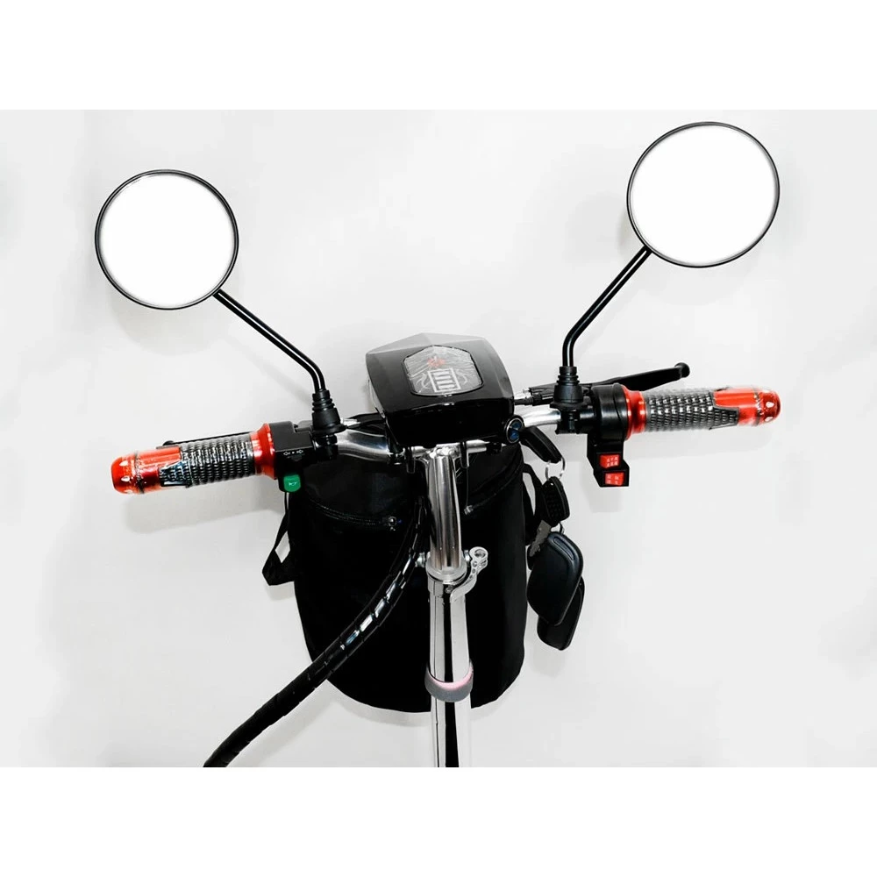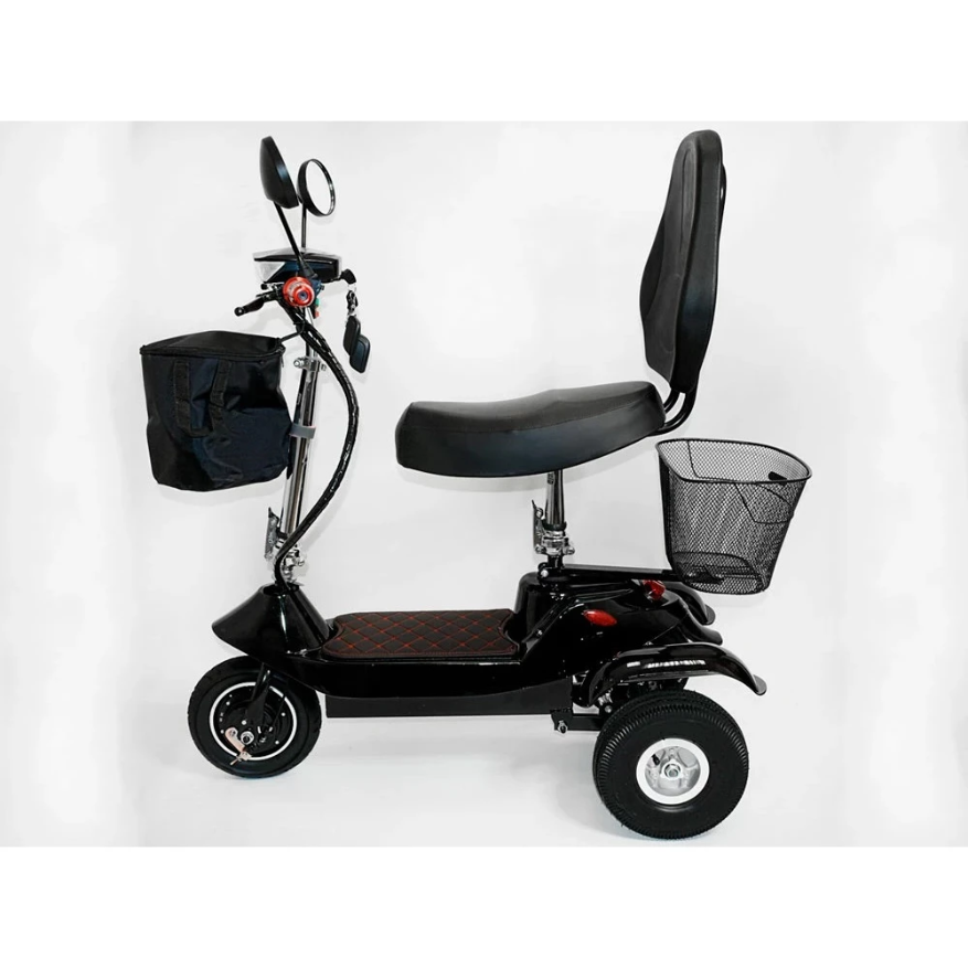 Даже при малых габаритах скутера, проектировщики смогли поставить сюда большое и мягкое сидение с прямой спинкой, которые позволяет кататься на трицикле долго и без усталости. Широкая дека электроскутера способна комфортно уместить обе ноги на ней. Переднее колесо скутера может поворачивать практически перпендикулярно относительно задних, что заметно увеличивает манёвренность и даёт возможность разворачиваться, почти не сдвигаясь с места.