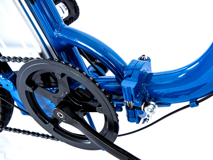 Рама велосипеда изготовлена из алюминиевого сплава 6061, который, являясь прочным и легким, обеспечивает надежность конструкции, не утяжеляя ее. Подседельный штырь можно настроить по высоте. За ним расположен аккумулятор, что, в свою очередь, положительно влияет на развесовку в процессе езды. Батарею можно быстро снять для подзарядки от электрической сети 220 В. Время полной зарядки составляет 5-6 часов. Седло у велосипеда мягкое и довольно широкое, комфортное для долгих поездок. На силовом приводе присутствует специальный разъем для быстрого снятия заднего колеса.
