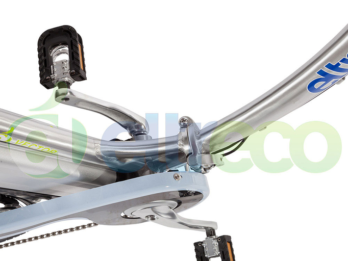 Электровелосипед Eltreco Vector 500W объединил свободу и комфорт передвижения с удобством хранения и транспортировки. Модель базируется на заниженной складной алюминиевой раме, разработанной в Британии. Надежная и крепкая, с прочным замком, она выдерживает нагрузку до 110 кг, при этом вес велогибрида небольшой – всего 26 кг. Руль и педали также складываются, что позволяет разместить байк в квартире, офисе или гараже, значительно экономя пространство.
