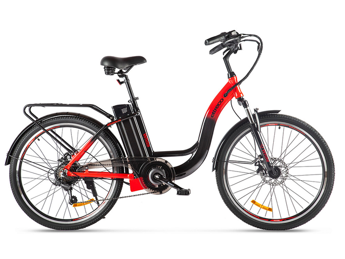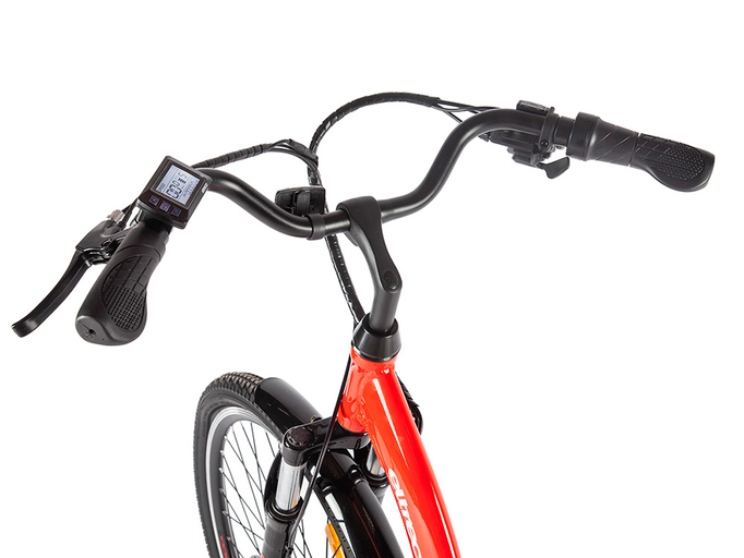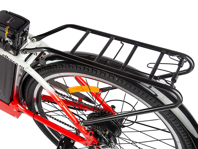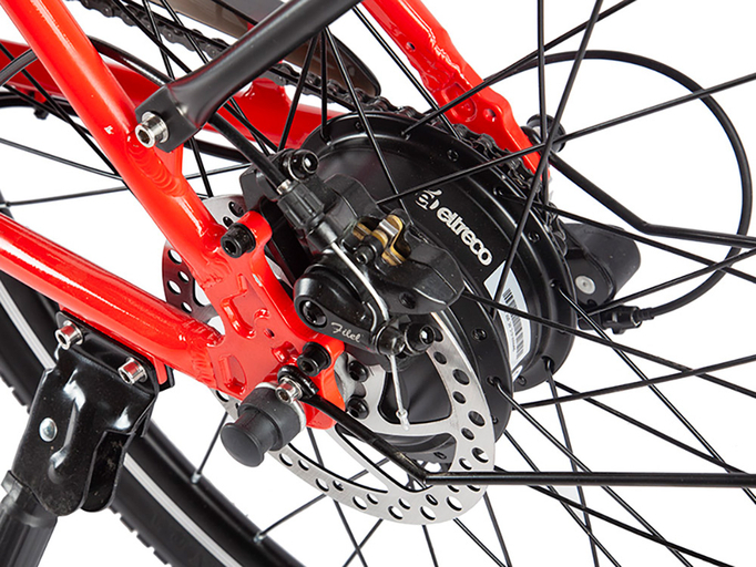 На электровелосипеде установлено заднее мотор-колесо Eltreco мощностью 250 Вт. Максимальная скорость, которую можно развить, – 25-30 км/ч. На одном заряде литий-ионного аккумулятора на 36 В, 8 Ач можно проехать до 40 км в смешанном режиме. Батарея расположена за подседельным штырем и является быстросъемной.