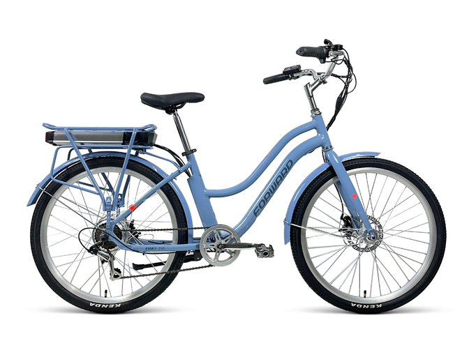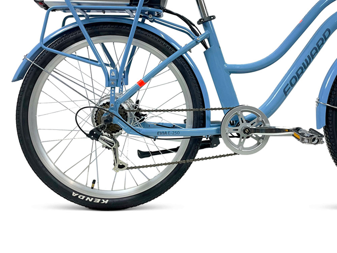 Forward Evia 26 E-250 – комфортабельный женский электровелосипед-круизер. Собран на заниженной раме, изготовленной из алюминиевого сплава 6061. Жесткая стальная вилка делает конструкцию байка еще прочней и долговечней, а надежная система дисковых механических тормозов Tektro MD-M280 (160 / 160 мм) позволяет быстро остановить велосипед в любой ситуации. Универсальные покрышки Kenda 26"x1,95" обеспечивают комфортную езду как по асфальтированным городским, так и по грунтовым парковым дорогам. Регулировка механических скоростей осуществляется с помощью переключателя Shimano RD-TY21 (6 скоростей). Размер рамы составляет 16".