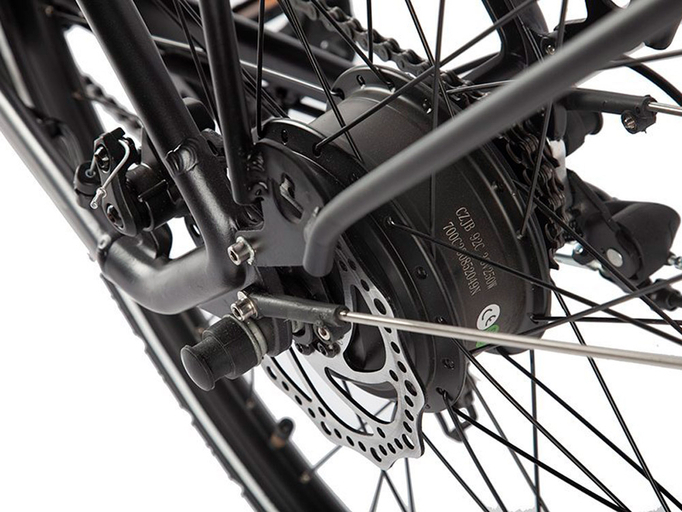 Велогибрид оборудован электромотором мощностью 250 Вт, встроенным в заднее колесо. Литий-ионный аккумулятор на 36 В, 10,4 Ач интегрирован в раму и является быстросъемным. Максимальная скорость – 32-35 км/ч. Расстояние, которое можно проехать на одном заряде батареи, – до 40 км.