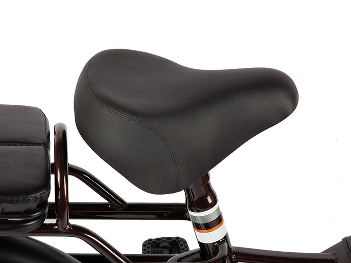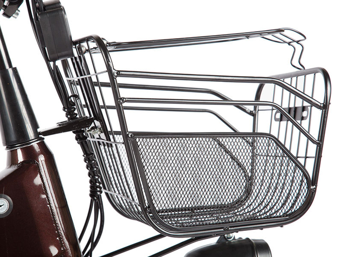 Электробайк имеет мощную стальную раму, массивность которой играет первоочередную роль в обеспечении безопасности райдеров и стабильности во время езды. Двойная подвеска (передняя регулируемая вилка и задние пружинные амортизаторы) эффективно сглаживает неровности и ухабы, минимизируя тряску. Размер колес – 24 дюйма. Дорожные покрышки с универсальным рисунком протектора обладают отличными сцепными свойствами и хорошим накатом. Открытая рама позволяет мужчинам и женщинам легко садиться в повседневной одежде. Широкое седло, высокий руль, задний багажник-трансформер, раскладывающийся в широкую платформу, вместительная передняя корзина, крылья с брызговиками – актуальные опции комфорта и уверенности в поездках по городских и проселочным дорогам.