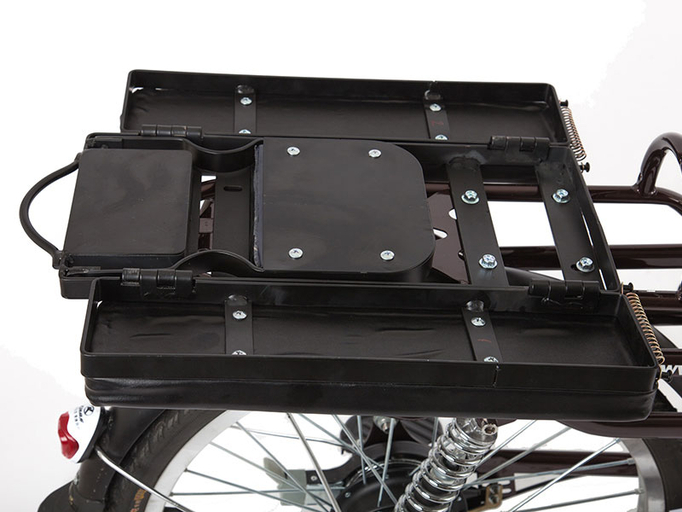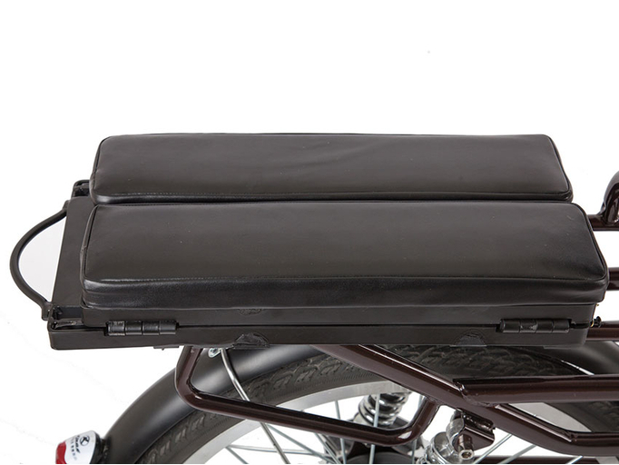 Электровелосипед Green City e-ALFA L оборудован функциональным багажником-трансформером, который легко превратить из мягкого и удобного пассажирского сиденья со спинкой в широкую площадку для перевозки габаритных грузов (коробок, сумок и прочего). Крупная центральная подножка снизу существенно облегчает парковку груженого велосипеда. Спереди расположена корзина поменьше, куда во время поездки можно положить личные вещи, продукты и многое другое. В темное время суток безопасность езды обеспечивают яркая светодиодная фара и стоп-сигнал. Полноразмерные крылья с брызговиками защищают одежду от слякоти. Специальный кожух на цепи предохраняет ее от грязи и повреждений.
