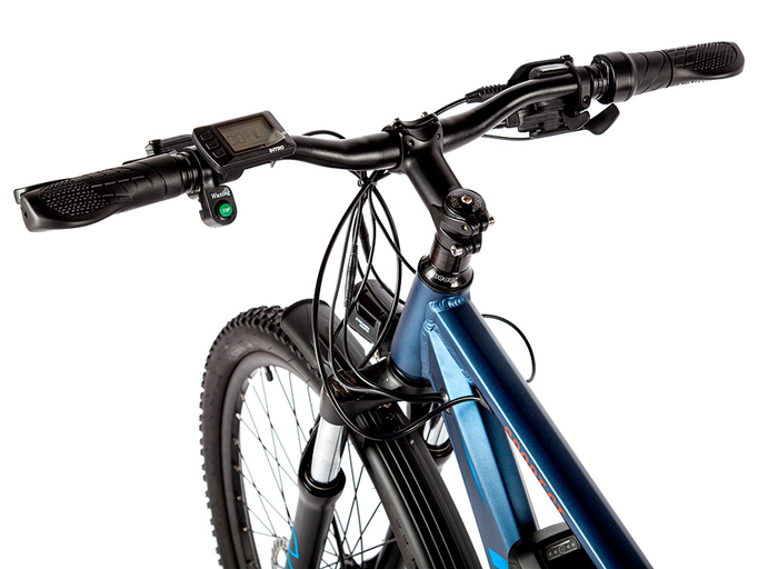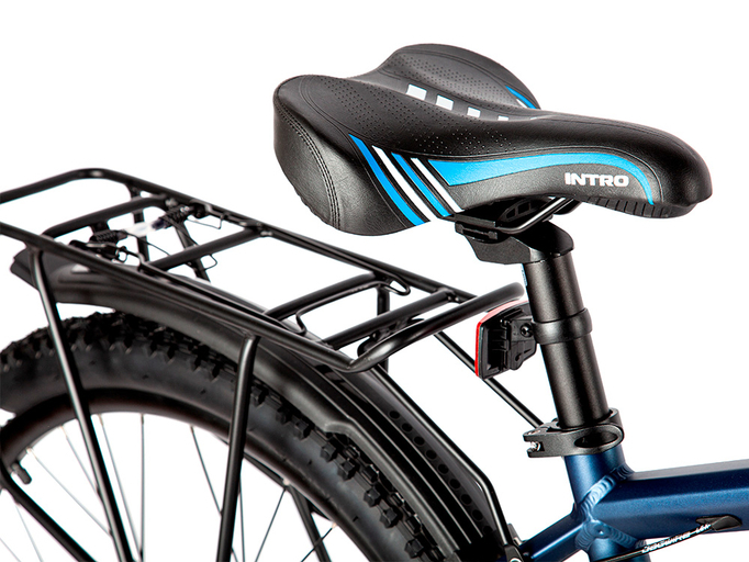Рама INTRO Sport GT изготовлена из сплава алюминия, благодаря чему электровелосипед прочный, но в то же время легкий. Его вес – всего 21 кг. Рама – хардтейл. Передняя амортизационная вилка сглаживает дорожные неровности. Большие колеса диаметром 27,5 дюймов способствуют высокой проходимости по городским и загородным ландшафтам. Покрышки с универсальным протектором Kenda обеспечивают надежное сцепление с дорожным покрытием. Велогибрид оснащен качественным навесным оборудованием с 7 механическими скоростями, дисковыми гидравлическими тормозами, информативным дисплеем с 5 уровнями ассистента и гибкой системой настроек, передней светодиодной фарой, усиленным металлическим багажником, крыльями.