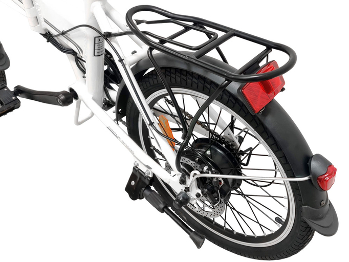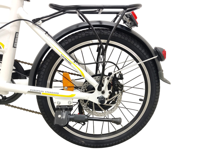 Велогибрид оснащен небольшими 20-дюймовыми колесами. Покрышки со сликовым протектором являются идеальным решением для городского байка. Полноразмерные металлические крылья с брызговиками защищают велосипедиста от брызг и грязи, вылетающих из-под колес. Велосипед оснащен крепким задним багажником, на который можно прикрепить велосумку и с комфортом путешествовать по городу.