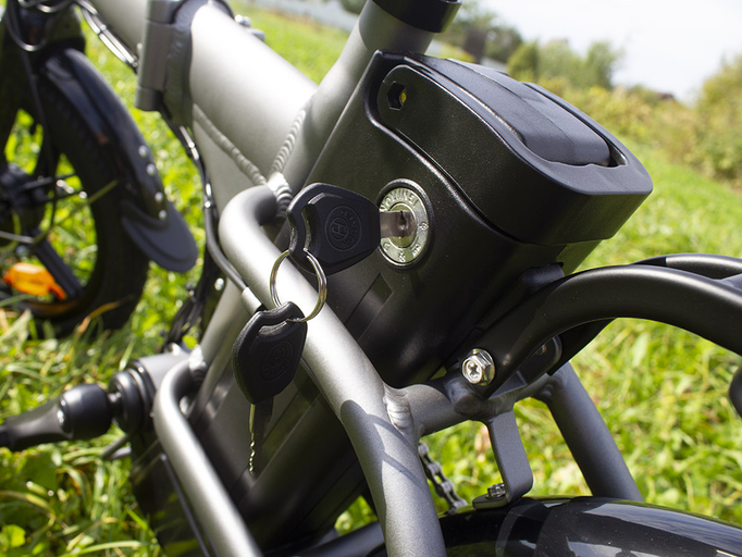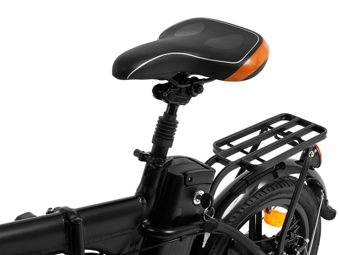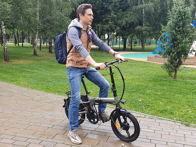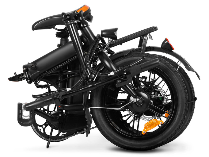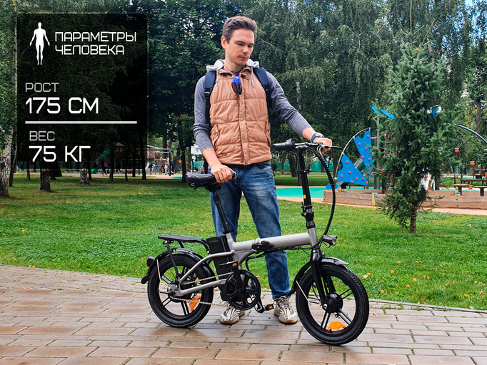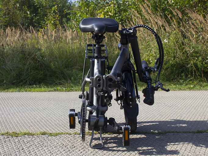 Велогибрид собран на складной алюминиевой раме. В сложенной виде модель очень компактна и легко помещается в пассажирский лифт, багажник автомобиля. Велосипед также очень удобно хранить дома и перевозить общественным транспортом. Сзади расположен крепкий багажник, на который можно поставить сумку.
