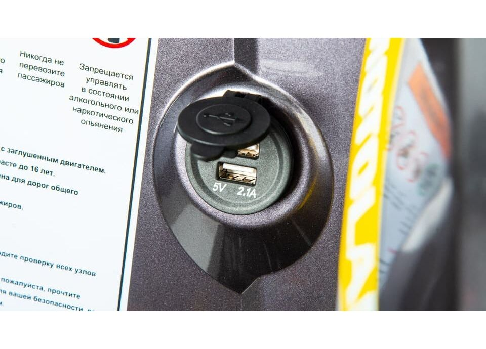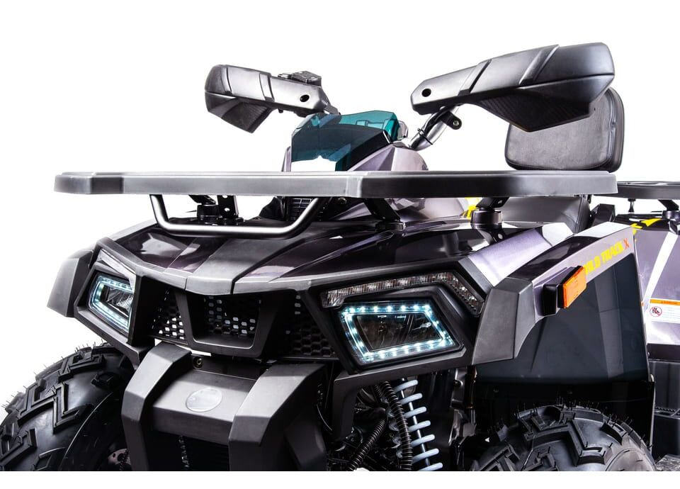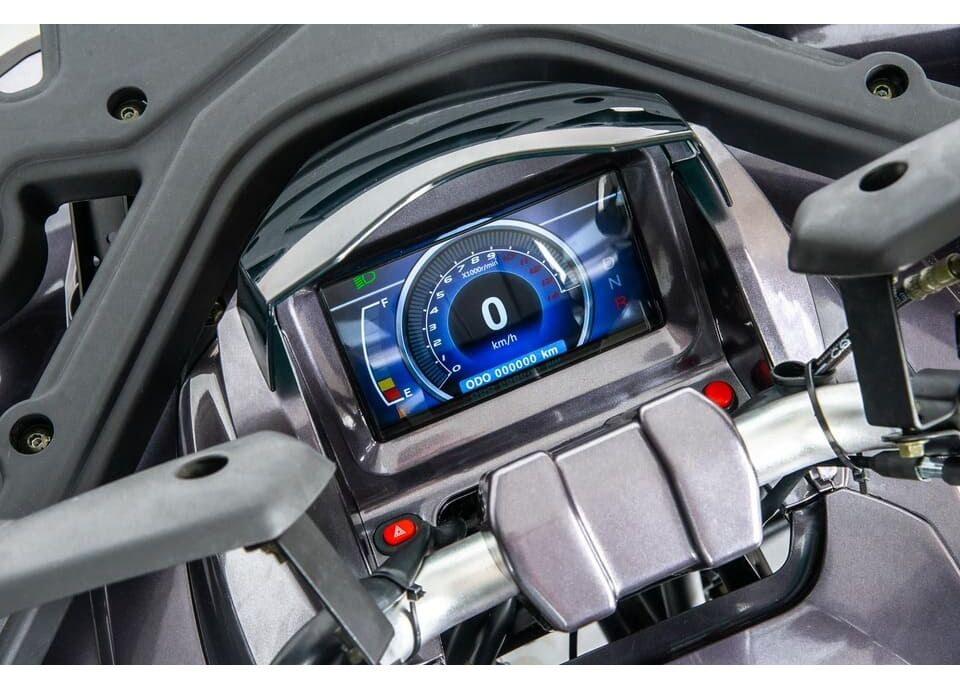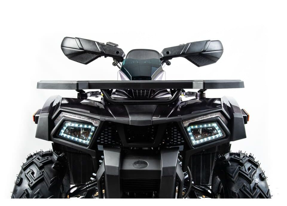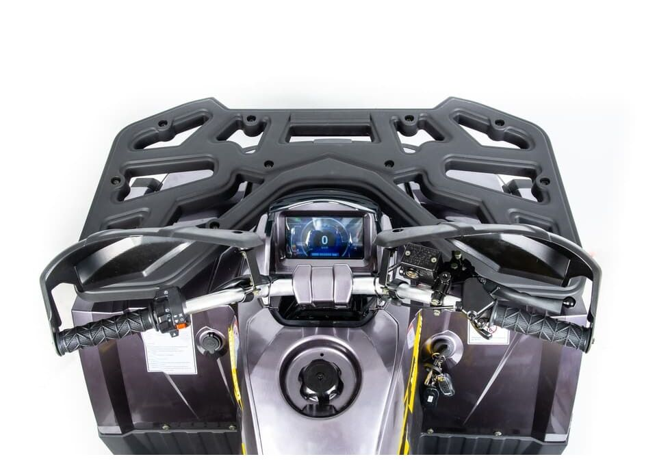 Квадроцикл также оснащен всеми необходимыми элементами для комфортной и безопасной эксплуатации: подогрев ручек, зеркала, спидометр, сигнализация, передний и задний багажники, а также дополнительные элементы, такие как защита рук и днища, передний и задний бамперы, лебедка и фаркоп. Высокий дорожный просвет в 280 мм и колесная база 1250 мм обеспечивают отличную проходимость даже в самых сложных условиях.