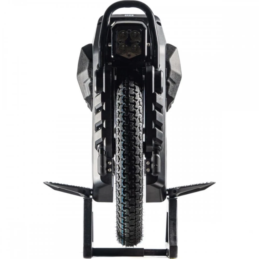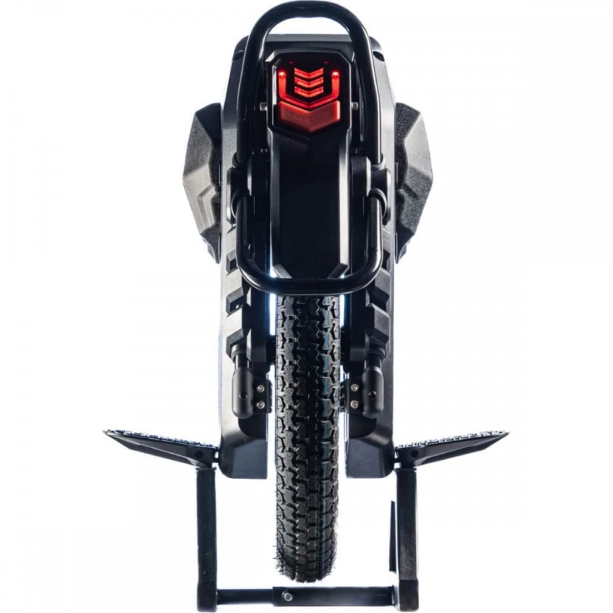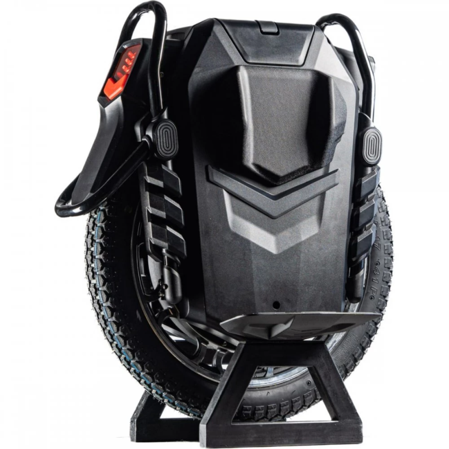 Моноколесо – компактное и эргономичное. Общий вес техники составляет 44 кг. Наличие выдвигающейся телескопической ручки обеспечивает удобную транспортировку изделия. Педальная часть длинная, нескользящая благодаря шипам, не допускает случайного соскальзывания стоп. По длине педали составляют 26,4 см, от поверхности земли – 17,8 см. Яркая светодиодная фара с возможностью регулировки угла наклона допускает движение в ночное время и непогоду. Наличие не бликующего на солнце монохромного дисплея обеспечивает контроль скоростных показателей, пробега и заряда батареи. При мощности оригинального моноколеса 3500 Вт и емкости АКБ 2700 Втч пользователь без труда может достичь скорости в 72 км/ч, преодолеть за максимально короткий промежуток времени приличное расстояние. 22 - дюймовые колеса с шипованными покрышками обеспечивают плавность движения и отличную сцепляемость с поверхностью. При приобретении моноколеса в комплектацию входят мягкие заводские подушки.