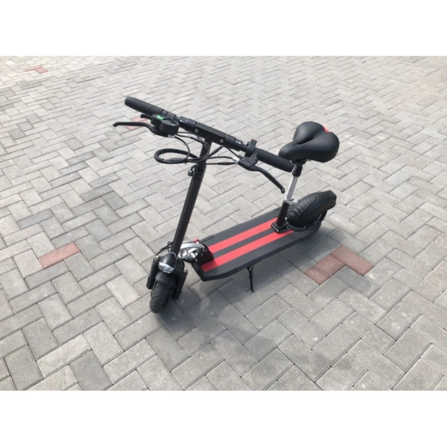 На электросамокате установлен литий-полимерный аккумулятор 9 А*ч емкости, полного заряда хватает на 35 км. Чтобы зарядить его необходимо включить в сеть 220 вольт на 4 часа. В комплекте идет регулируемое сидение. При длительном движении комфортно ехать сидя. Платформа широкая на ней помещается две ступни рядом. На руле с разных сторон два рычага, газ и тормоз. Есть информативный дисплей.