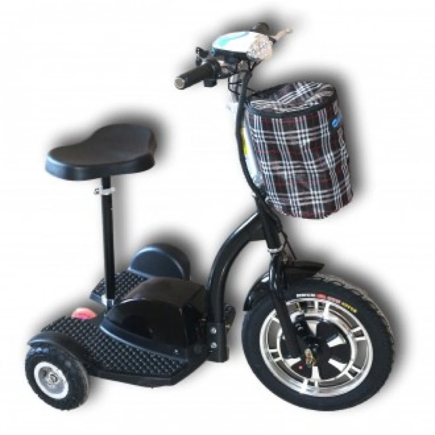 Мощность двигателя 500 Вт, грузоподъемность 150 кг, можно взять груз или второго человека. Удобное регулируемое по высоте сидение, при необходимости можно убрать. Широкая платформа не скользит, на нее удобно ставить ноги. Колеса разного диаметра, переднее 16 дюймов, задние 4. Надежности придает тормозная система.